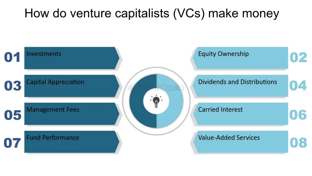 | Equity Ownership | VCs acquire shares in startups, aiming to sell them at a higher valuation. |